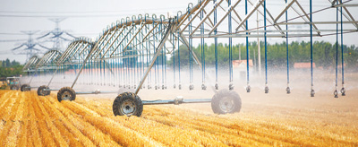 6月17日,在山東省東營市廣饒縣李鵲鎮(zhèn)前艾家村的田地里,農(nóng)民正在使用桁架式噴灌機(jī)澆地。
