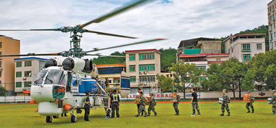 6月17日,廣東省梅州市平遠(yuǎn)縣體育場,直升機(jī)在運(yùn)送救援物資。