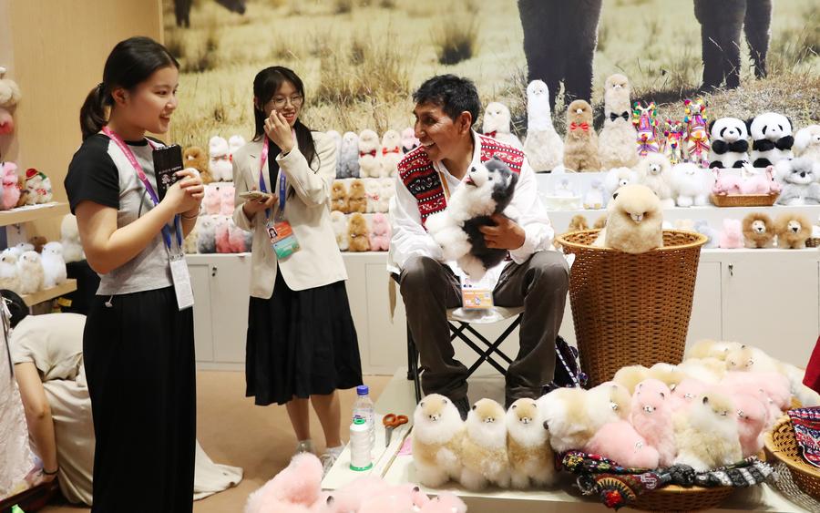 馬馬尼大叔在上海進(jìn)博會“溫暖駝”品牌展臺內(nèi)向一名參觀者展示剛制作完成的羊駝玩偶(2023年11月5日攝)。新華社記者 方喆 攝