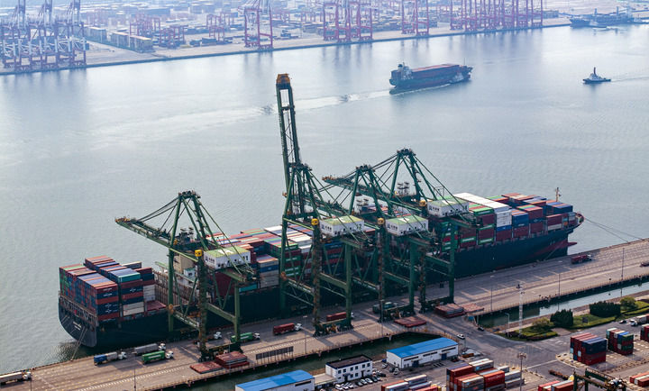 7月3日,一艘集裝箱貨輪??吭谔旖蚋厶窖髧?guó)際集裝箱碼頭(無人機(jī)照片)。新華社記者趙子碩 攝
