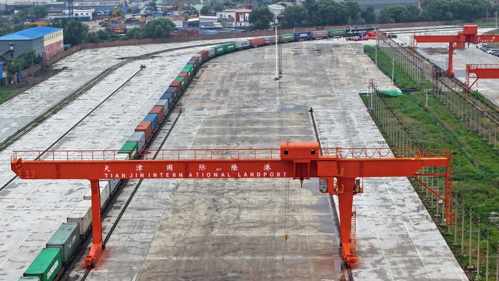 7月1日在天津國(guó)際陸港拍攝的準(zhǔn)備發(fā)車的中歐班列(無人機(jī)照片)。新華社記者李然攝