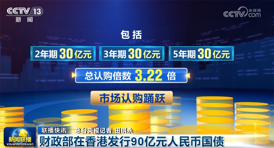 財(cái)政部7月10日在香港招標(biāo)發(fā)行2024年第三期人民幣國(guó)債,發(fā)行規(guī)模為90億元,包括2年期、3年期、5年期各30億元??傉J(rèn)購(gòu)倍數(shù)3.22倍,市場(chǎng)認(rèn)購(gòu)踴躍。今年財(cái)政部在香港計(jì)劃發(fā)行550億元人民幣國(guó)債,進(jìn)一步完善常態(tài)化發(fā)行機(jī)制,支持鞏固提升香港國(guó)際金融中心地位。