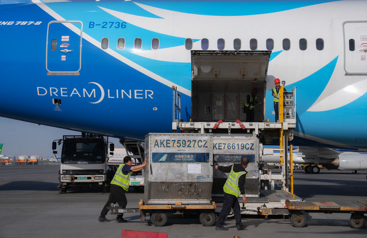 南航工作人員在烏魯木齊地窩堡國際機(jī)場裝卸國際航班貨物(2024年4月28日攝)。新華社發(fā)(車捷 攝)