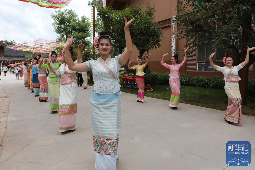 在云南省西雙版納傣族園景區(qū)內(nèi)的傳統(tǒng)傣寨曼聽村,村民跳起迎賓舞(7月7日攝)。新華社發(fā)(李云生 攝)