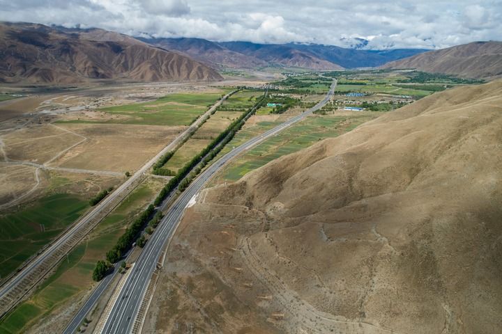 俯瞰西藏拉薩市至日喀則市區(qū)間的交通網(wǎng)絡(luò),從左至右依次為農(nóng)村公路、鐵路、國道和高等級公路(2024年6月27日攝,無人機(jī)照片)。