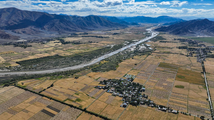 西藏日喀則市年楚河流域縱橫交錯的鄉(xiāng)村道路(2023年9月6日攝,無人機(jī)照片)。新華社記者 晉美多吉 攝