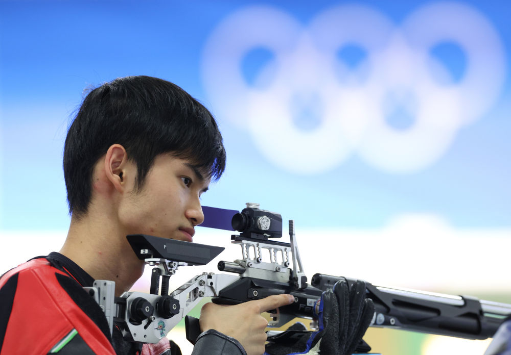 7月28日,中國(guó)選手盛李豪在男子10米氣步槍資格賽中。新華社記者 趙丁喆 攝