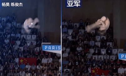 我們把動(dòng)作放慢,對(duì)冠亞軍選手動(dòng)作作對(duì)比,不難發(fā)現(xiàn),在空中轉(zhuǎn)體翻騰動(dòng)作和入水水花上,中國的兩位選手明顯更勝一籌。