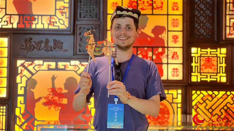 俄羅斯翻譯家、現(xiàn)任莫斯科物理技術學院中文系副教授羅子毅與皮影合影。人民網(wǎng) 李欣洋攝