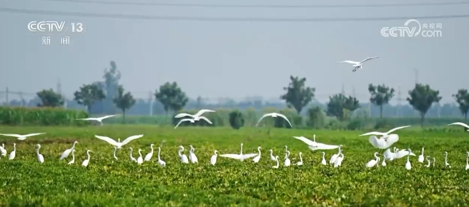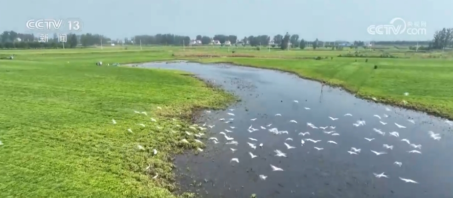 在河南周口市淮陽(yáng)區(qū),由于近期降雨頻繁,當(dāng)?shù)毓胚\(yùn)河不少低洼地帶變成灘涂濕地,多群白鷺匯聚于此,棲息覓食。