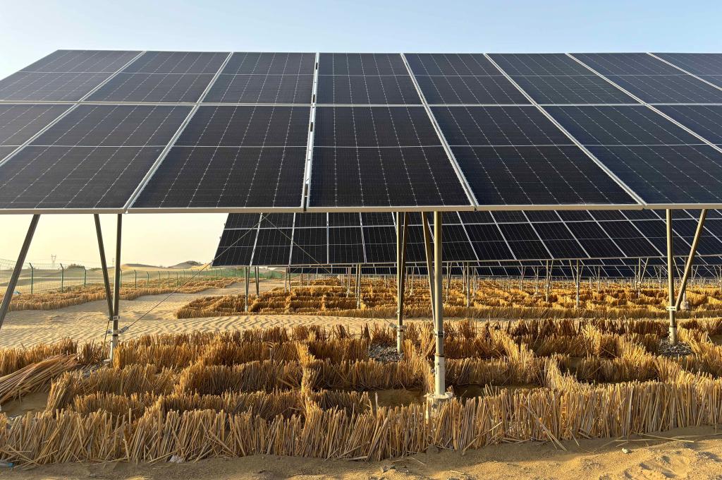 從新疆庫(kù)爾勒市出發(fā),沿著烏若高速向東南方向駛?cè)搿八劳鲋!薄死敻缮衬沟?,?xiě)著“沙戈荒光伏生態(tài)治沙示范項(xiàng)目”大字的一座光伏電站映入眼簾。光伏板下及光伏電站外圍,青黃色的蘆葦稈扎入沙中構(gòu)成“圍棋盤(pán)”式的草方格,將黃沙牢牢包圍。