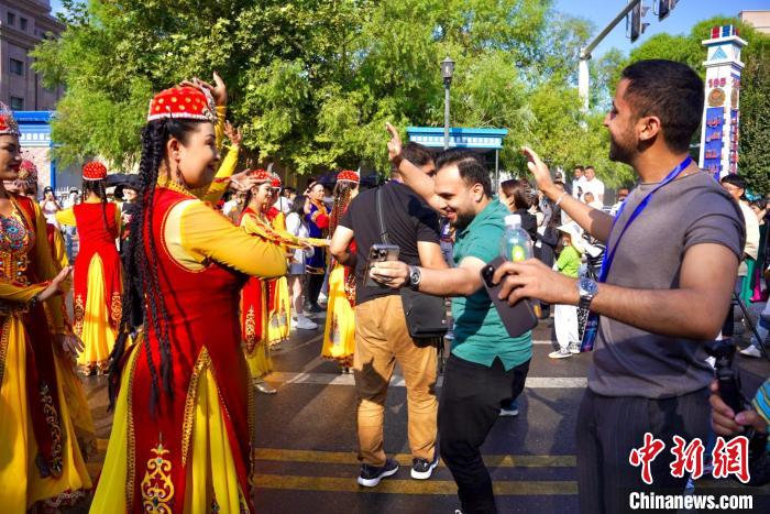 伊犁哈薩克自治州是多民族聚居區(qū),擁有47個(gè)不同民族。僅在伊寧市喀贊其民族風(fēng)情街,就居住著維吾爾族、哈薩克族、回族等13個(gè)不同民族的民眾。當(dāng)日,巴基斯坦媒體和智庫人士來到喀贊其街道,他們?cè)诮诌呌^看民族舞蹈表演,還邂逅了一場(chǎng)維吾爾族婚禮。