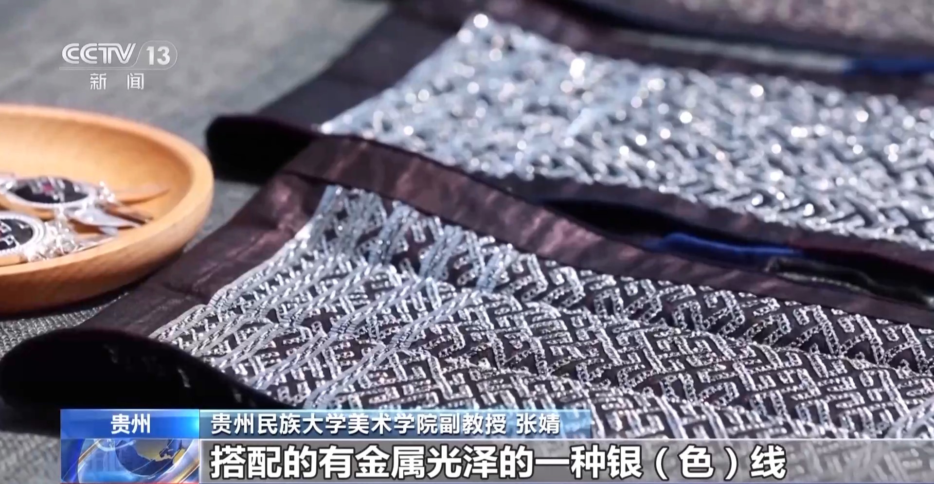貴州民族大學(xué)美術(shù)學(xué)院副教授 張婧:錫繡會(huì)用到一些藏青色的底布、暗色系的絲線,搭配有金屬光澤的一種銀色線,以此形成強(qiáng)烈對(duì)比。對(duì)中國(guó)傳統(tǒng)刺繡、苗族刺繡來(lái)說(shuō),它的藝術(shù)風(fēng)格都是具有自己鮮明特征的。