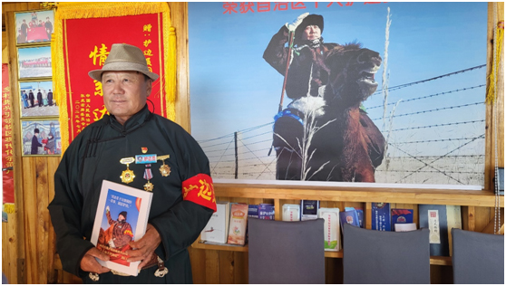 圖門的祖父是當時最早的一批護邊員,當時中蒙邊界的巡邊任務重,他主動承擔起護邊任務。圖門的父母也從正值年華開始了艱辛困苦的守邊生活。受祖父和父母的影響,剛滿18歲的圖門應征入伍,成為一名軍人,1990年光榮地加入了中國共產黨。退伍后,放棄在市區(qū)工作的機會毅然選擇回到草原,從年邁的父親手中接過接力棒,成為家中第三代護邊員。