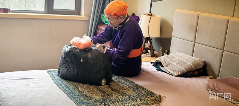 都貴瑪額吉收拾冬天要穿的棉袍(央廣網(wǎng)見習記者 邵玉琴 攝)