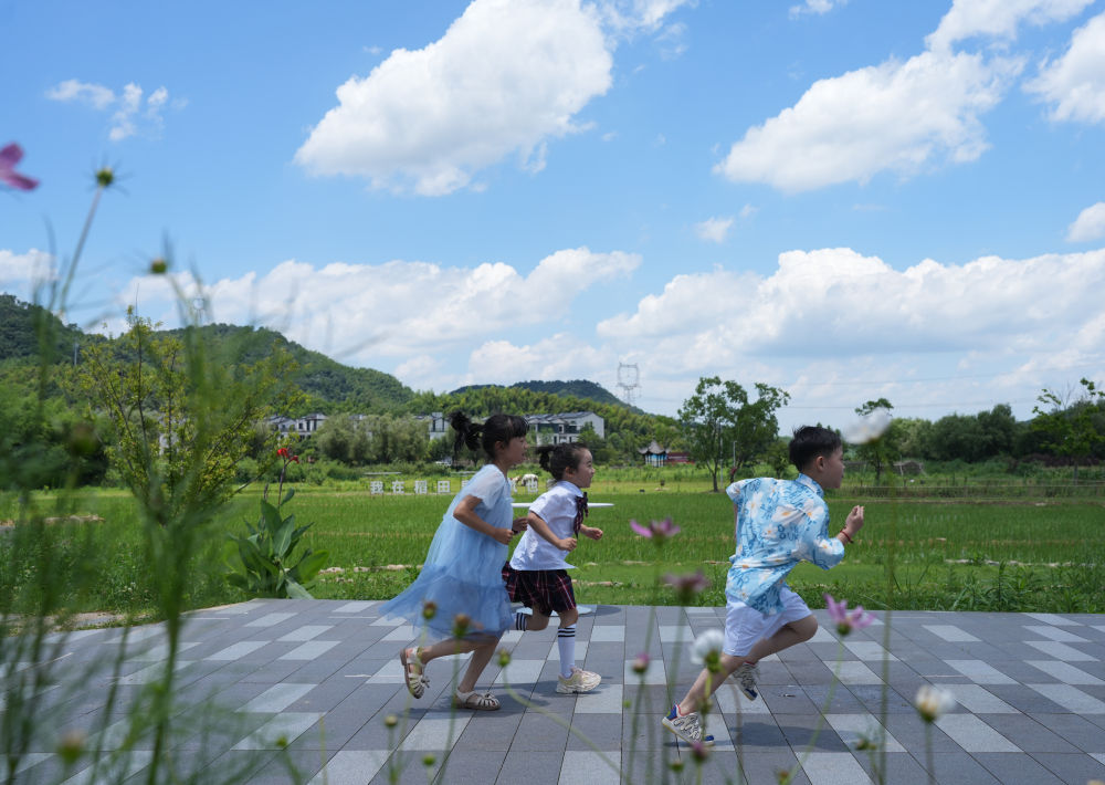 兒童在余姚市梁弄鎮(zhèn)的田野間奔跑(7月3日攝)。新華社記者翁忻旸 攝