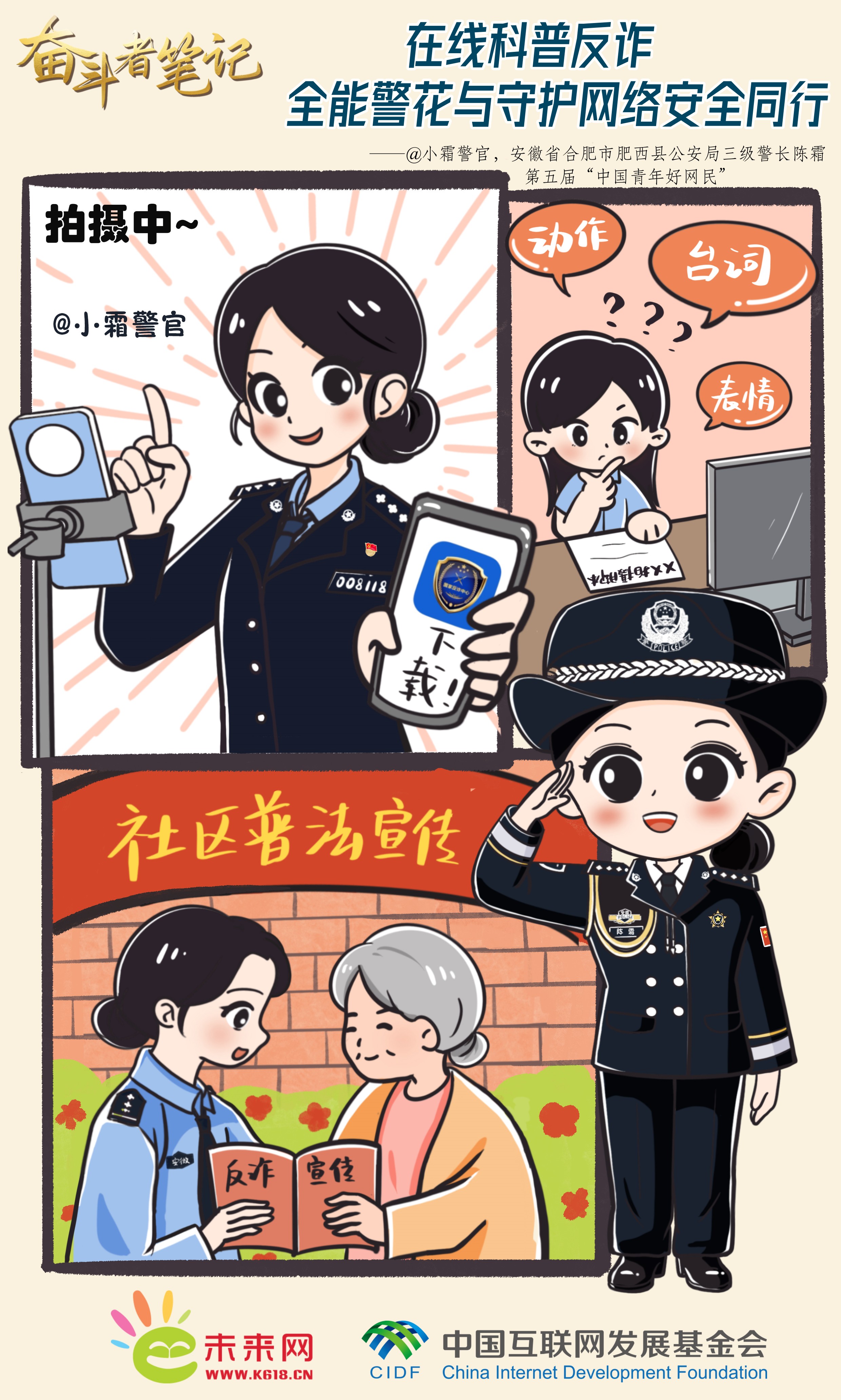 “一網(wǎng)情深”筑防線,心系百姓護安寧。面對在辦案過程中遇到的百姓養(yǎng)老錢、救命錢被騙的情況,陳霜愈發(fā)感到防范電詐和打擊電詐同樣重要。她創(chuàng)建“小霜警官”警務(wù)自媒體賬號,認真研究分析電信網(wǎng)絡(luò)詐騙的規(guī)律特點、思考防詐辦法,用大家喜聞樂見的形式為百姓普法、宣傳反詐知識。她還積極探索宣傳新路徑,緊跟時事熱點,將防詐知識寫成幽默風(fēng)趣的段子、引人入勝的故事和生動的短劇。自2016年以來,“小霜警官”累計推出了反詐、普法、便民等內(nèi)容原創(chuàng)短視頻500余個,總粉絲量過800萬,全平臺播放量超50億。正如她的個性簽名所寫——“一個特別接地氣的警察朋友”,親民的形象和接地氣的宣傳方式,讓她受到了廣大網(wǎng)友的關(guān)注和喜愛。