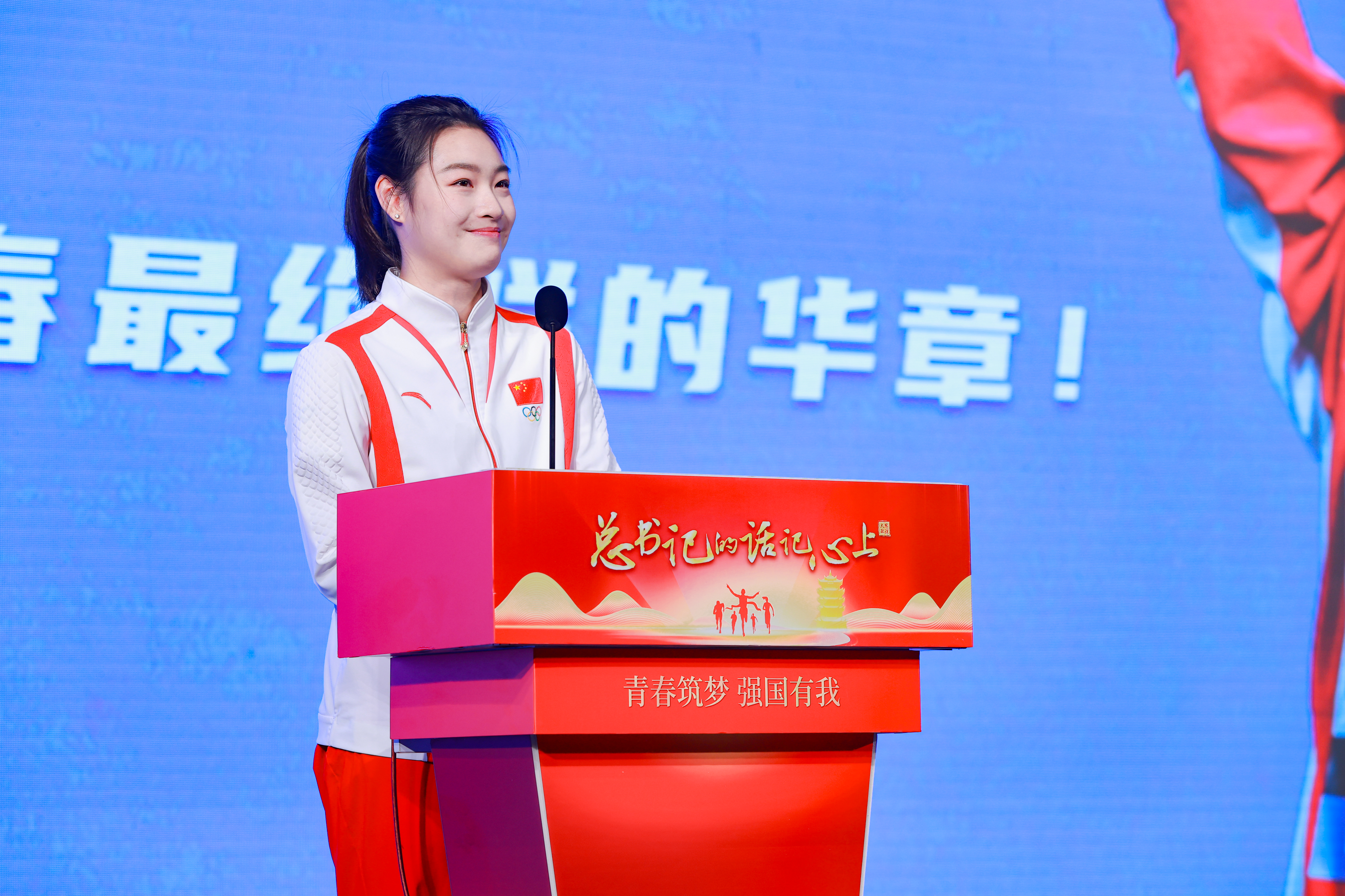 奧運(yùn)冠軍昌雅妮驚喜亮相,一到現(xiàn)場就引起了學(xué)生們的歡呼與喝彩。她和同學(xué)們親密合影,引爆全場!接著,她登臺動(dòng)情講述奪冠背后的故事:“從跳校到奧運(yùn)冠軍,我的每一步都凝聚著汗水、淚水與堅(jiān)持……”回憶起訓(xùn)練的艱辛歷程,她幾度哽咽落淚,讓人心疼。決勝巴黎、綻放奧運(yùn)的背后,是堅(jiān)持的力量!昌雅妮以自己的切身經(jīng)歷,激勵(lì)青年學(xué)子:“只要有夢想,我們就不懼遠(yuǎn)航,堅(jiān)持的力量,將繪就青春最絢爛的華章!”