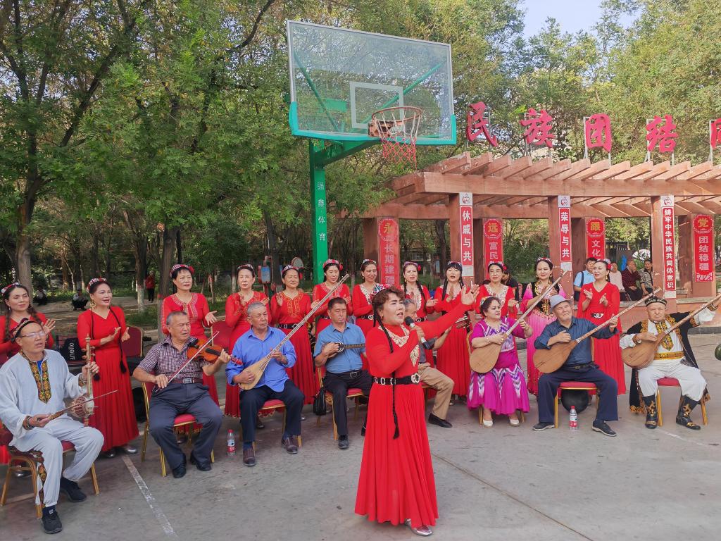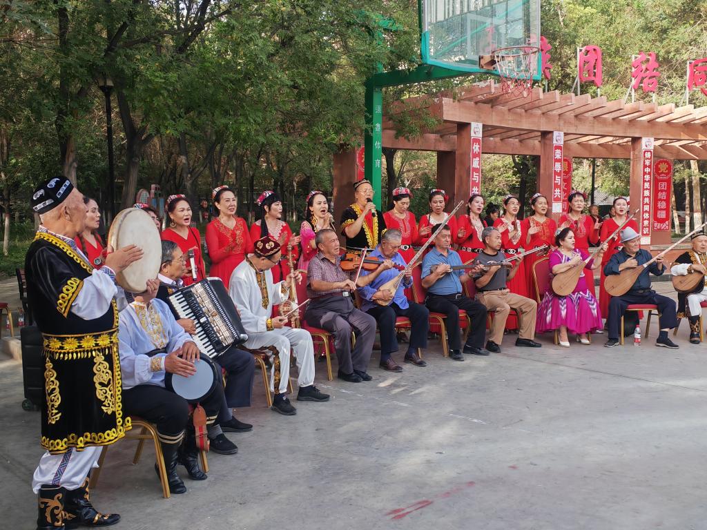 9月19日,庫爾勒市朝陽街道團結(jié)社區(qū)“石榴籽藝術(shù)團”正在為居民們表演。新華社記者顧煜 攝