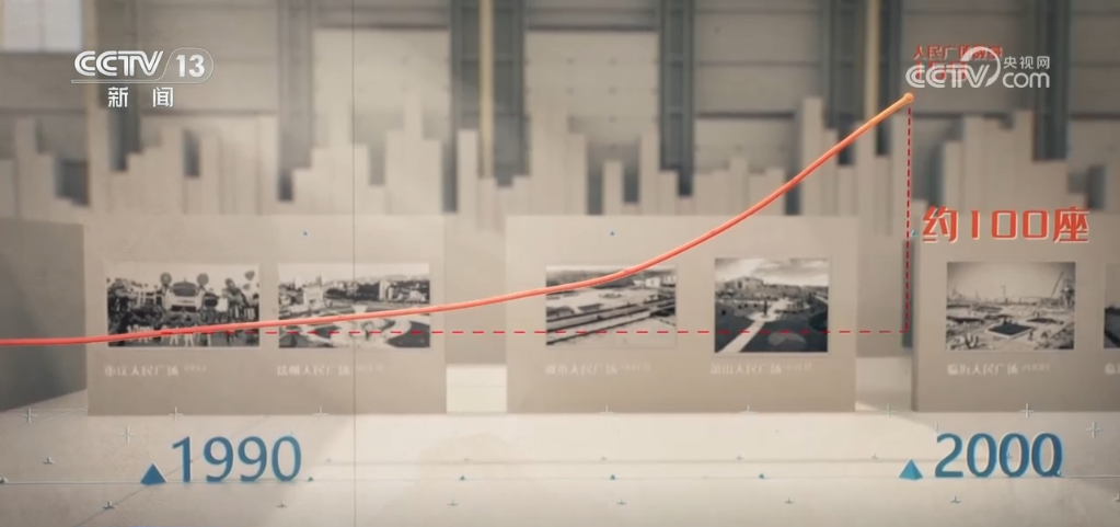 追溯歷史,將人民廣場(chǎng)的建設(shè)與時(shí)間線關(guān)聯(lián),我們發(fā)現(xiàn)了全國(guó)人民廣場(chǎng)建設(shè)的兩個(gè)重要時(shí)間節(jié)點(diǎn):在90年代,隨著城鎮(zhèn)化的步伐,更多的廣場(chǎng)滿足了人們對(duì)公共空間的新需求,大約有100座人民廣場(chǎng)在這十年間建成。2013年左右,一股新的建設(shè)浪潮出現(xiàn)在小型縣城,尤其是在剛剛擺脫貧困的地區(qū)興起,人民廣場(chǎng)的增量又與脫貧攻堅(jiān)的進(jìn)程同步見(jiàn)證了一塊塊土地從貧瘠到繁榮的動(dòng)人變遷。