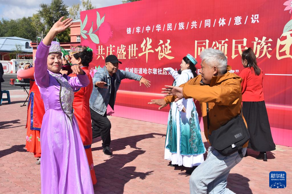 開闊的社區(qū)大院內(nèi),數(shù)十名各族群眾圍坐長桌旁,一邊品嘗各色美食,一邊欣賞居民的精彩表演,歡聲笑語不時(shí)傳出。這是新疆塔城市新城街道哈爾墩社區(qū)舉行的“鄰里節(jié)百家宴”,各族群眾展示民族歌曲,跳起歡快的舞蹈。