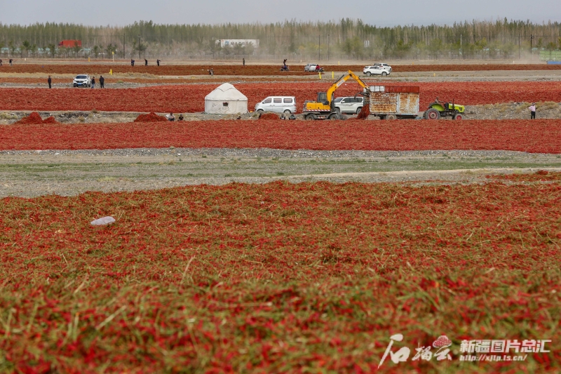 10月3日,種植戶在沙灣市安集海鎮(zhèn)萬(wàn)畝天然曬場(chǎng)翻曬辣椒。