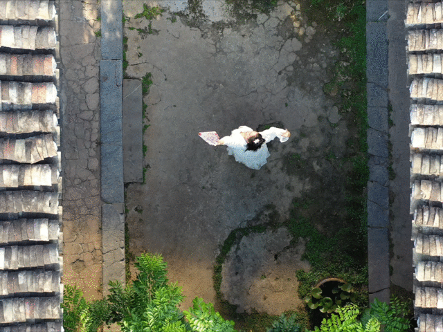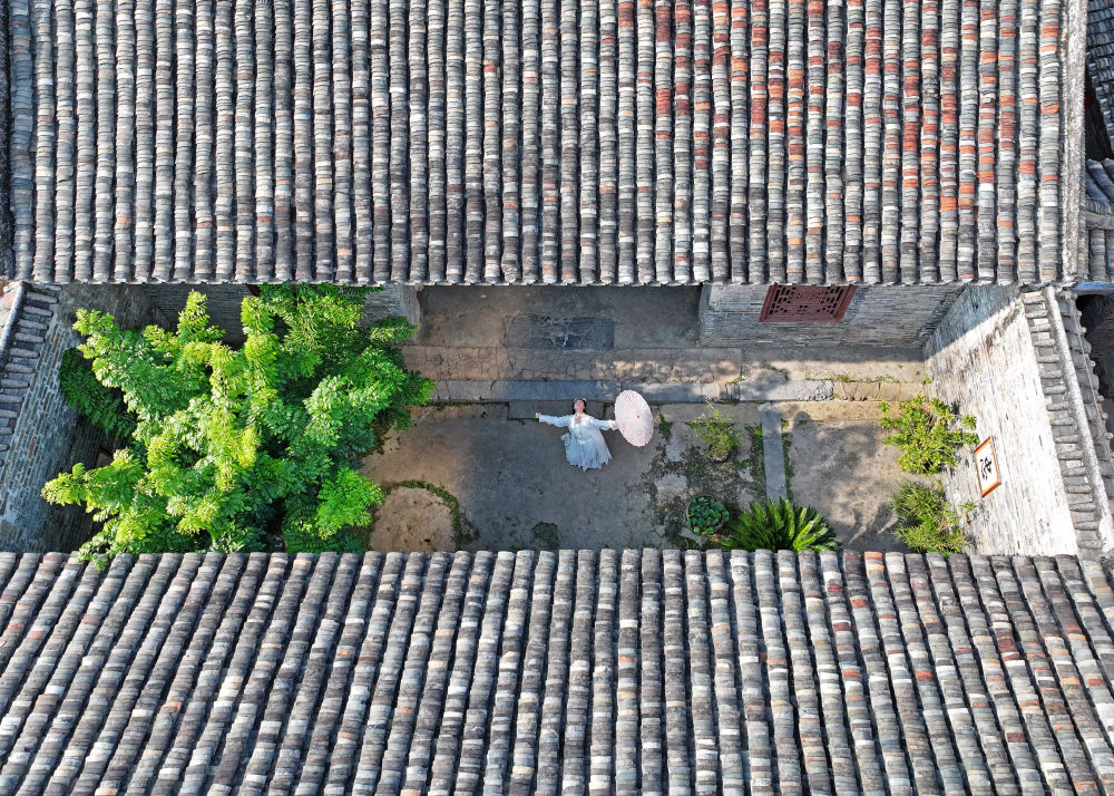 游客在廣西來賓市象州羅秀鎮(zhèn)納祿村的古宅中翩翩起舞(10月10日攝,無人機照片)。