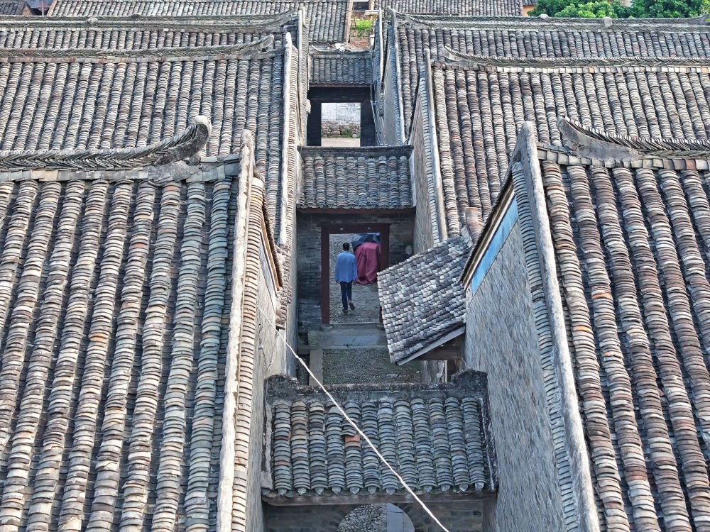 村民行走在廣西來賓市象州羅秀鎮(zhèn)納祿村的古巷中(10月9日攝,無人機照片)。