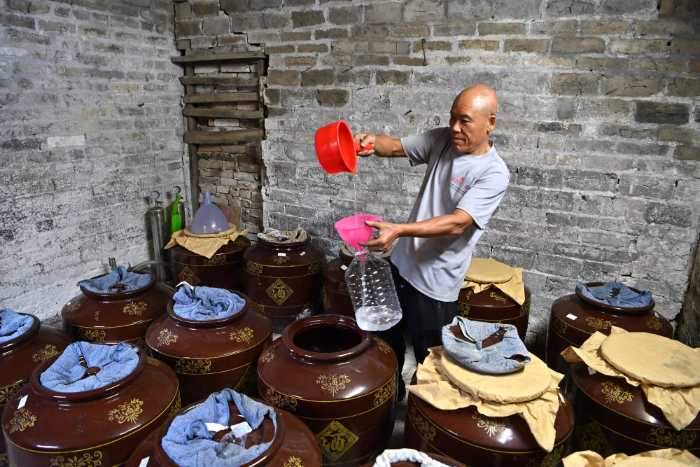一位村民在廣西來賓市象州羅秀鎮(zhèn)納祿村用水瓢裝自釀米酒(10月9日攝)。