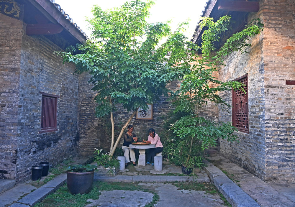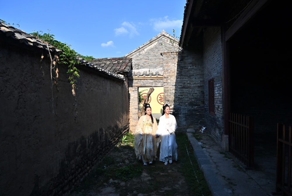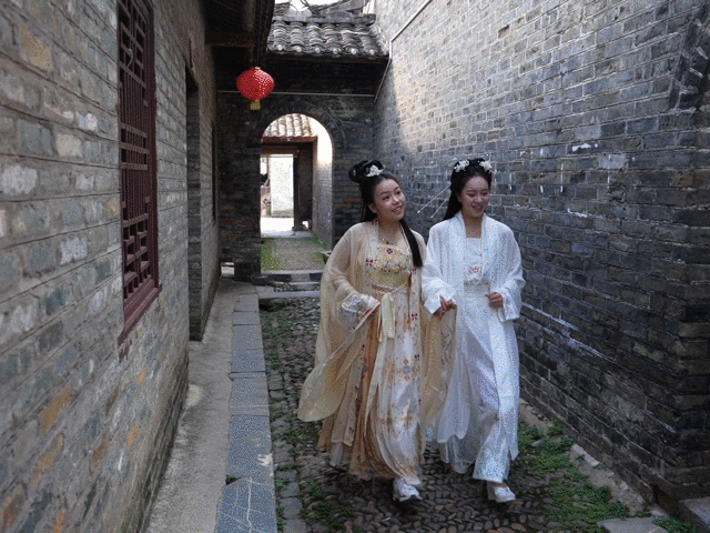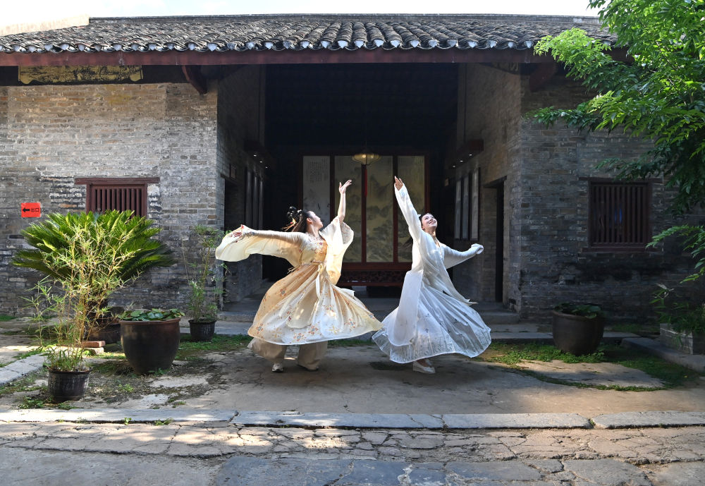 兩名游客在廣西來賓市象州羅秀鎮(zhèn)納祿村的古宅里翩翩起舞(10月10日攝)。