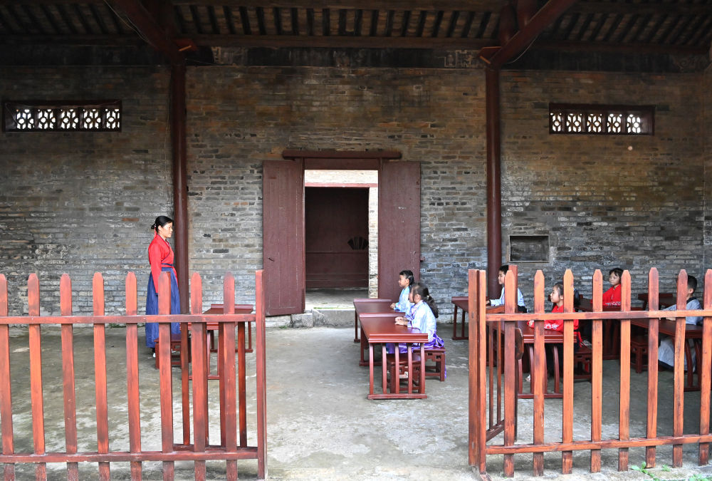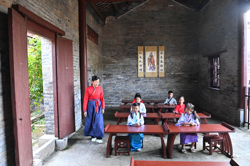 一名老師帶著幾名孩子在廣西來賓市象州羅秀鎮(zhèn)納祿村的古學堂里學習(10月10日攝)。