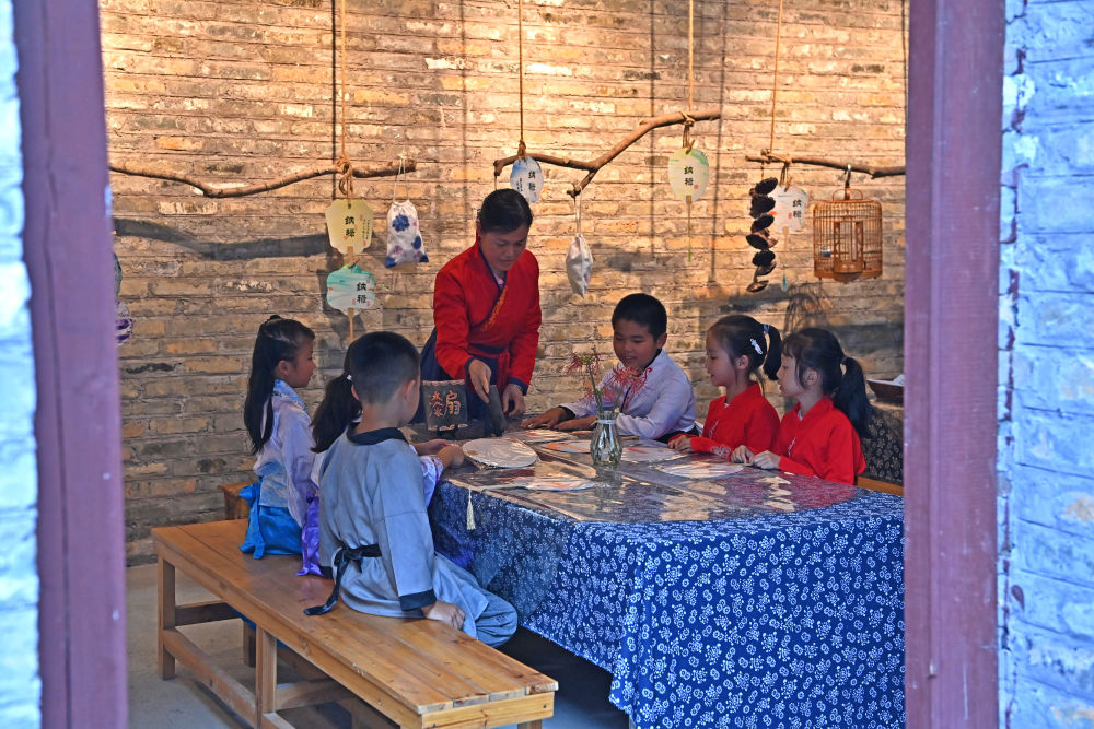 一名老師帶著幾名孩子在廣西來賓市象州羅秀鎮(zhèn)納祿村學習扇面制作(10月10日攝)。