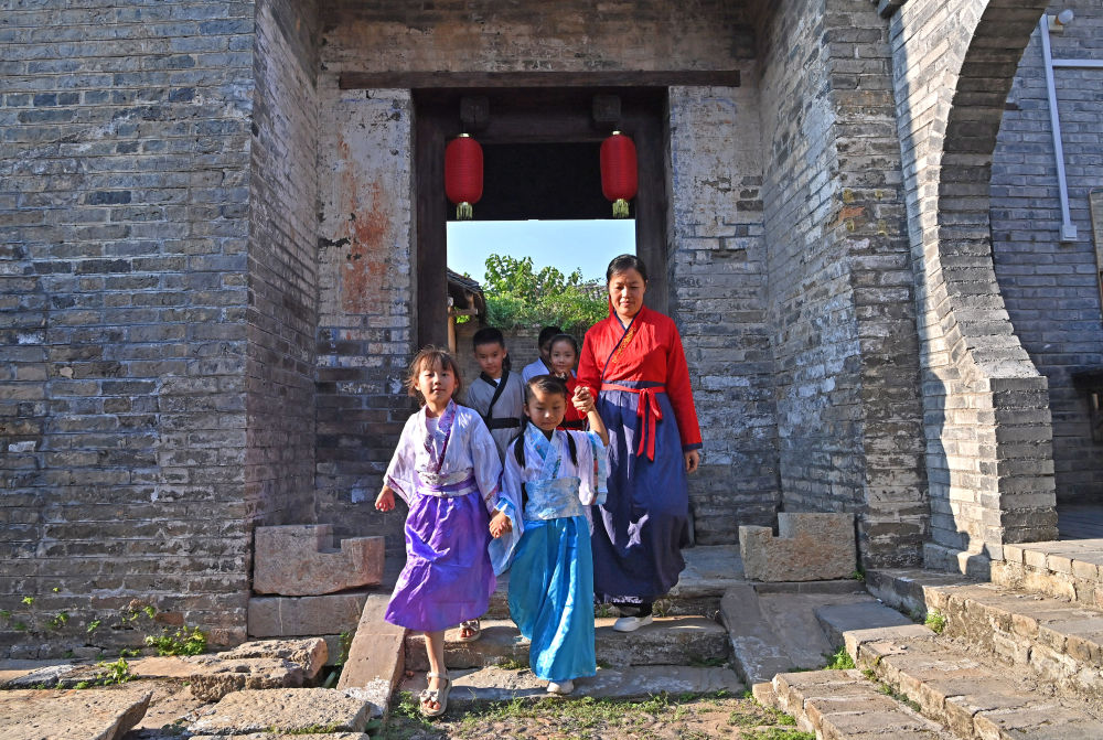 一名老師帶著幾名孩子行走在廣西來賓市象州羅秀鎮(zhèn)納祿村的古建筑群里(10月10日攝)。
