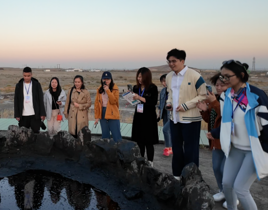 在黑油山最著名的景點(diǎn)——“跳跳泉油池”,黑油山景區(qū)講解員麥爾哈巴·肉扎洪帶領(lǐng)訪問(wèn)團(tuán)代表們利用壓力傳導(dǎo)作用,在它的周圍邊喊邊跳,眼見(jiàn)著它冒的泡泡越來(lái)越多,讓大家興奮不已。麥爾哈巴·肉扎洪說(shuō):“經(jīng)過(guò)三代人的努力,克拉瑪依變成了現(xiàn)在這樣宜居宜業(yè)宜游的現(xiàn)代化高品質(zhì)城市,希望可以把克拉瑪依艱苦創(chuàng)業(yè)的精神傳達(dá)給大家,也可以把這種活力傳達(dá)給大家?!?/p>
