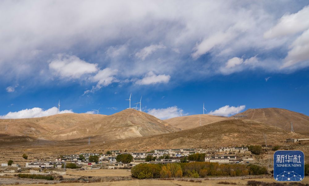 10月17日拍攝的位于西藏日喀則市薩迦縣的風力發(fā)電機組及山腳下的村莊。