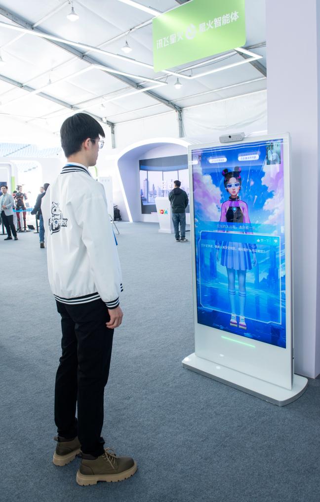 在第七屆世界聲博會上,虛擬人智能交互機(jī)在和觀眾互動交流。新華社記者 傅天 攝