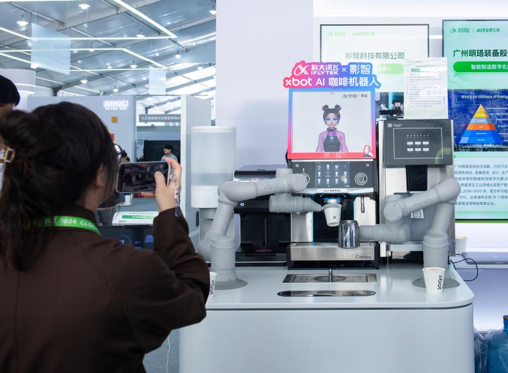 在第七屆世界聲博會上展出的AI咖啡機(jī)器人。新華社記者 傅天 攝