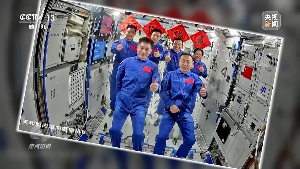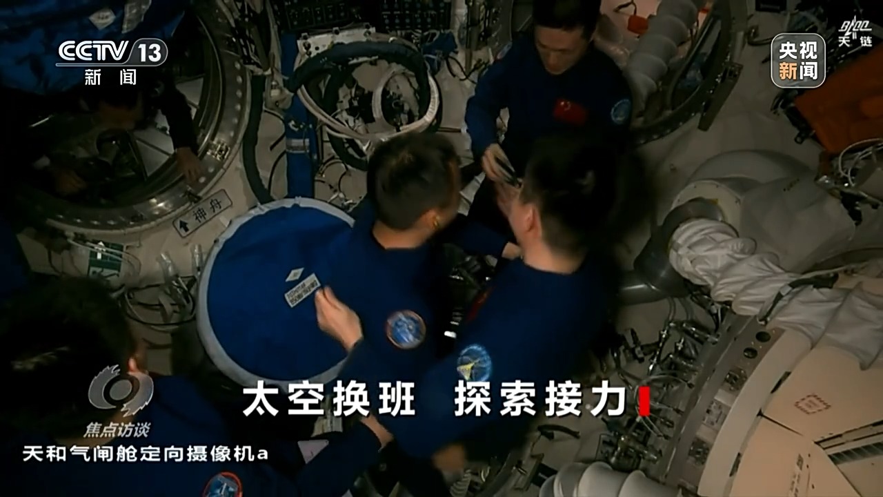 重返中國(guó)空間站的神十九航天員蔡旭哲打開艙門,再次體驗(yàn)失重,他輕松地就從飛船進(jìn)入空間站節(jié)點(diǎn)艙,和等待他們到來(lái)的神十八乘組來(lái)了一個(gè)大擁抱。第一次進(jìn)入空間站的兩位“90后”航天員也同樣受到了熱烈的歡迎。在打掃一新的空間站核心艙,歡迎儀式必不可少。