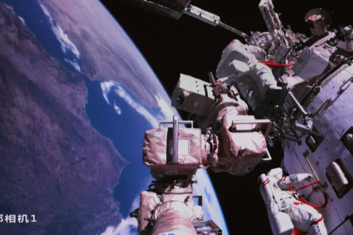 他們二人身著我國新一代“飛天”艙外航天服,上面的航天員簽名見證了中國航天一個(gè)又一個(gè)紀(jì)錄——