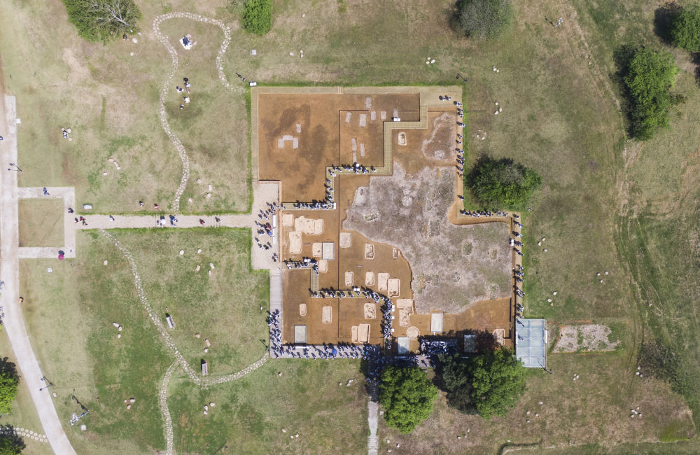 這是2024年4月18日拍攝的位于安徽省馬鞍山市含山縣境內(nèi)的凌家灘國(guó)家考古遺址公園墓葬祭祀?yún)^(qū)(無(wú)人機(jī)照片)。新華社記者 傅天 攝