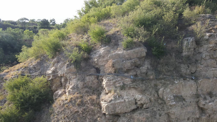 為防止碎石脫落將古棧道掩埋或毀壞,近幾年國(guó)家出資對(duì)此處棧道上的危巖體進(jìn)行加固。目前工程已竣工,古棧道上方有專業(yè)防護(hù)網(wǎng),新修的排水溝阻斷了上方雨水對(duì)古棧道的沖刷。