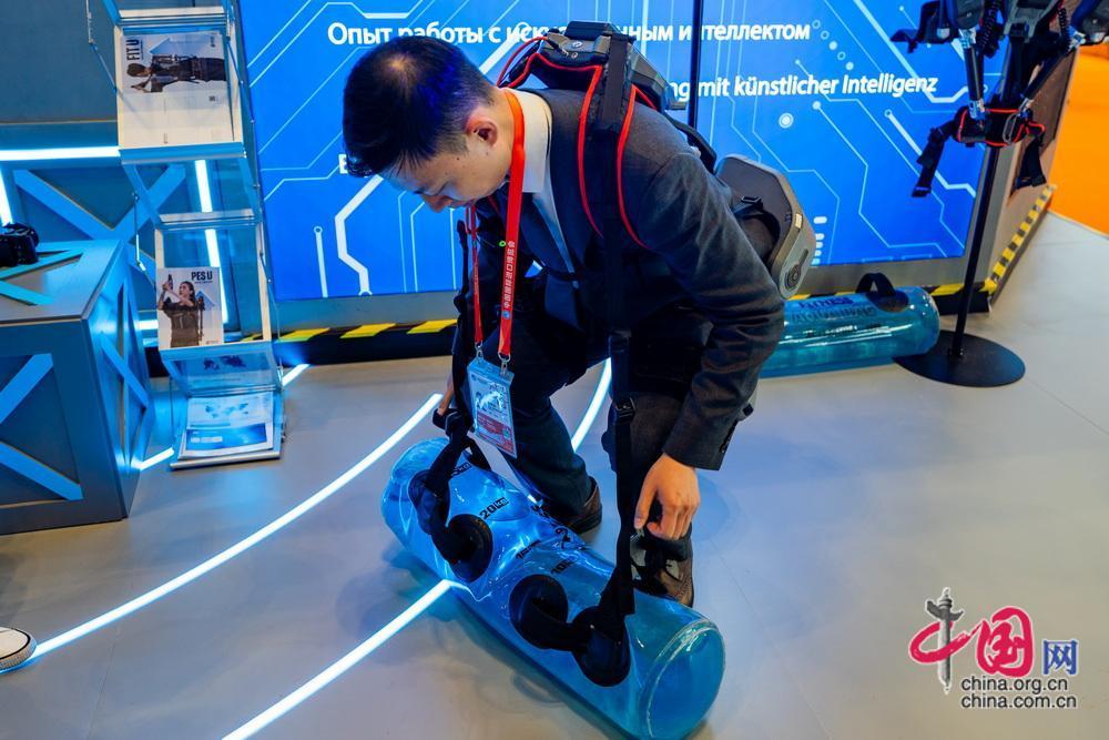 觀眾體驗(yàn)外骨骼機(jī)器人在工作中的實(shí)際應(yīng)用。中國網(wǎng)記者
