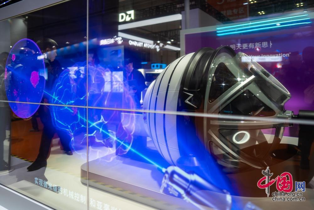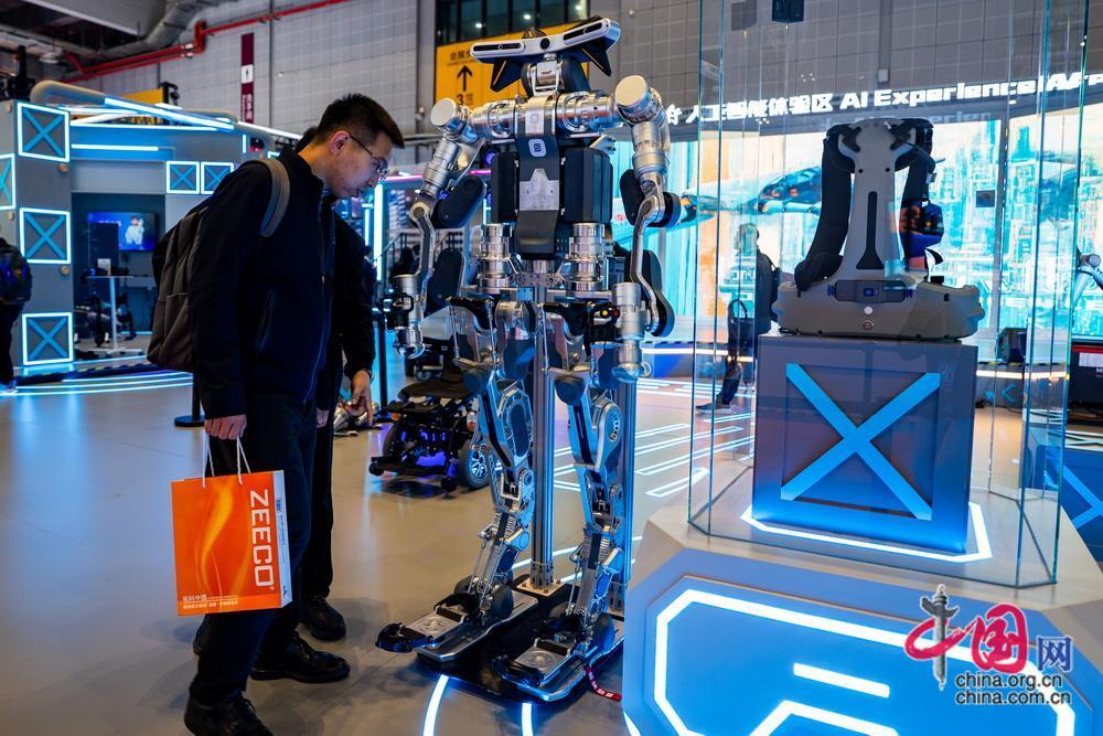 觀眾在智能裝備展示區(qū)圍觀新型外骨骼機(jī)器人。中國網(wǎng)記者