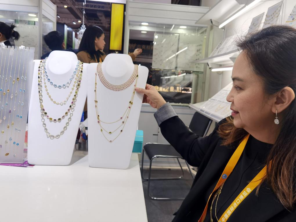 得益于共建“一帶一路”倡議和中國-東盟自由貿(mào)易協(xié)定的深化落實,阿拉尼婭一家的珠寶企業(yè)有了進軍中國廣袤市場的新計劃。這次她和家人帶來的珠寶飾品多達上百種款式,有鑲嵌紅寶石、祖母綠、碧璽等的項鏈、手鏈、戒指、吊墜等,吸引采購方駐足。