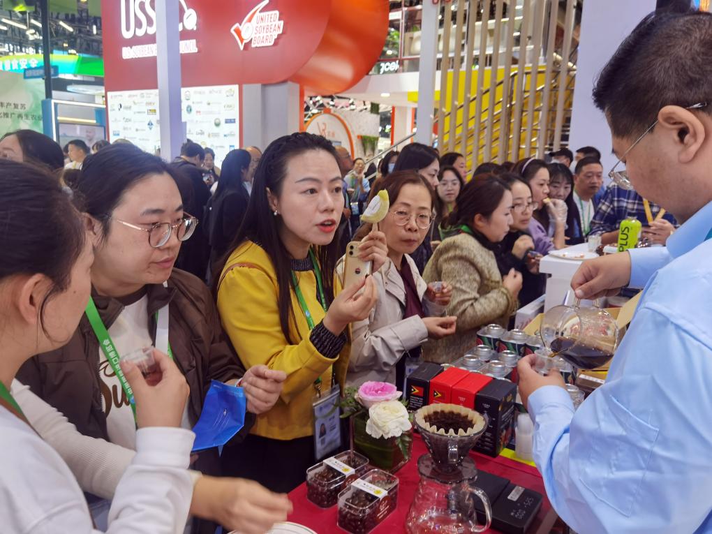 11月8日,采購商在東帝汶咖啡展位前駐足,一名參展方代表制作并介紹來自東帝汶的——“貓典”咖啡。 新華社記者 許曉青 攝