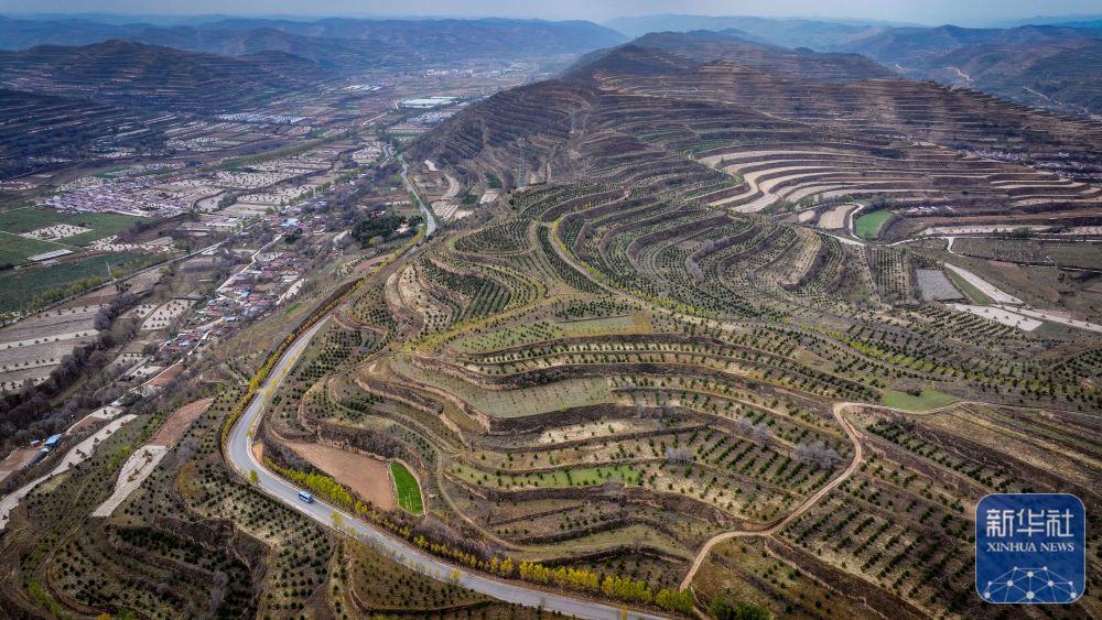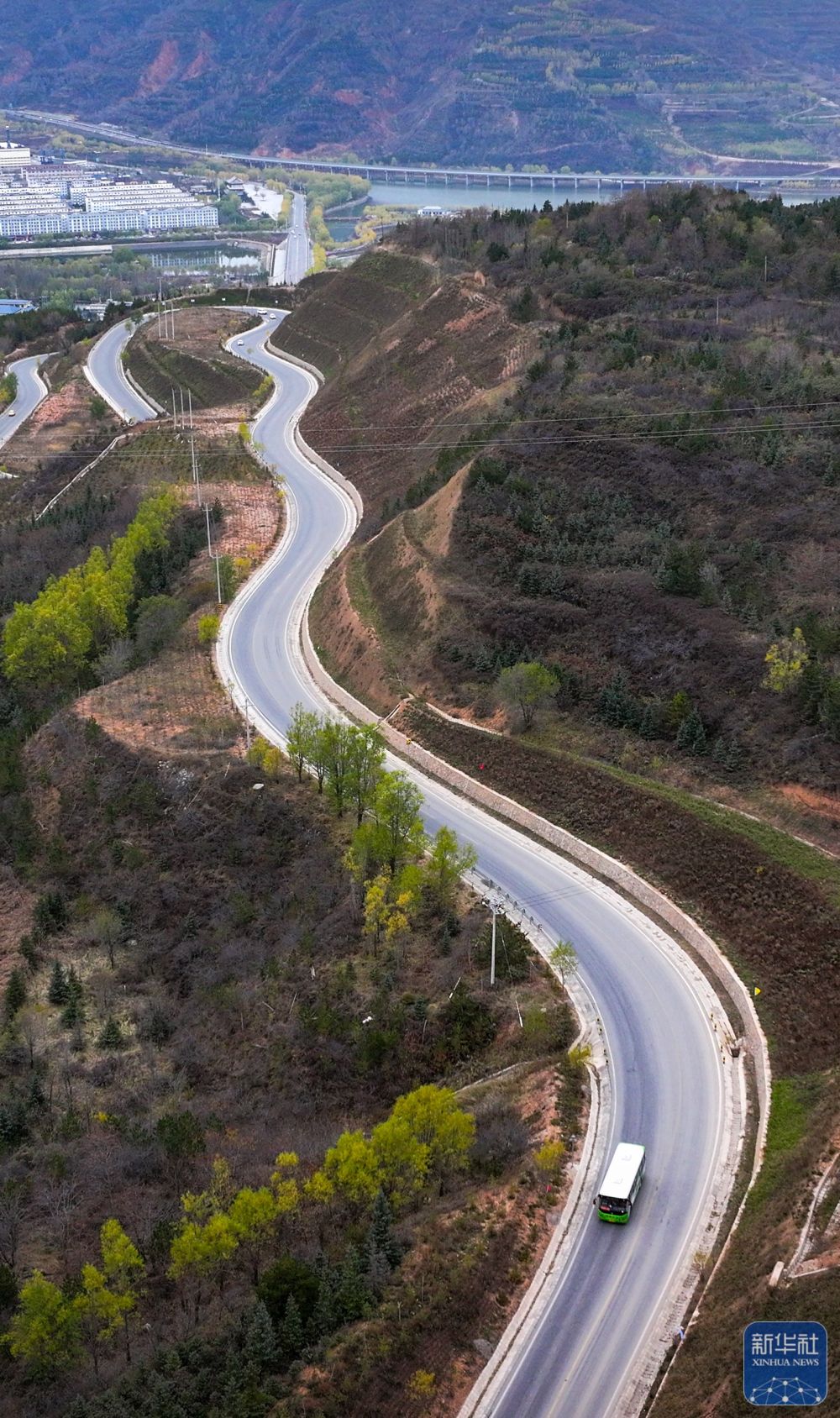 11月9日,一輛載有乘客和快遞物品的公交車(chē)從隆德縣城駛出(無(wú)人機(jī)照片)。