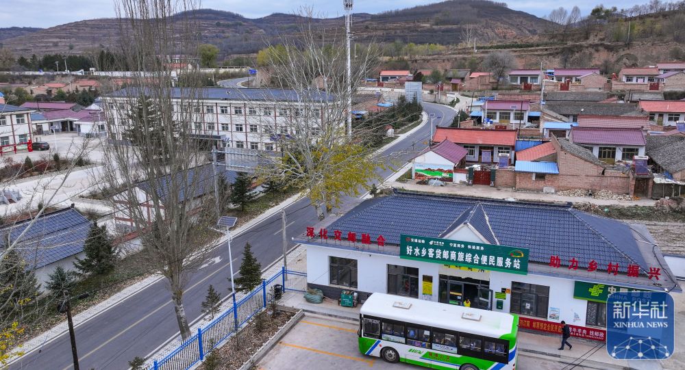 11月9日,一輛公交車(chē)停靠在隆德縣好水鄉(xiāng)客貨郵商旅綜合便民服務(wù)站,準(zhǔn)備卸下快遞(無(wú)人機(jī)照片)。