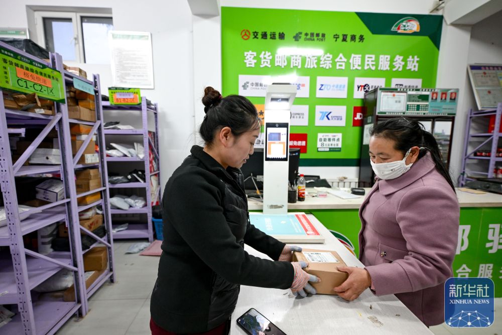 11月9日,村民(右)在隆德縣沙塘鄉(xiāng)客貨郵商旅綜合便民服務(wù)站取快遞。
