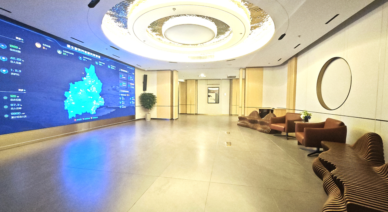 進(jìn)入中心,映入眼簾的是占據(jù)整面墻的智能大屏,中心內(nèi)所有公共區(qū)域的實(shí)時(shí)場(chǎng)景一覽無(wú)余。