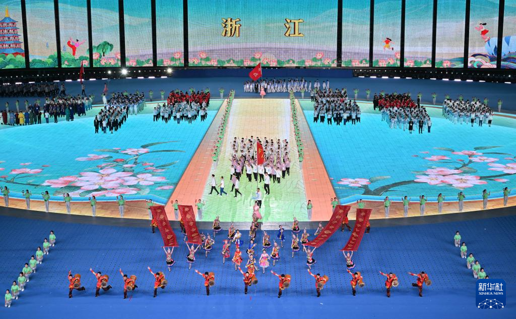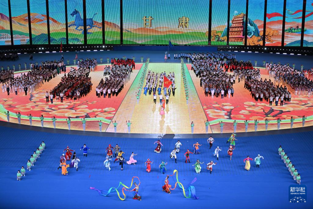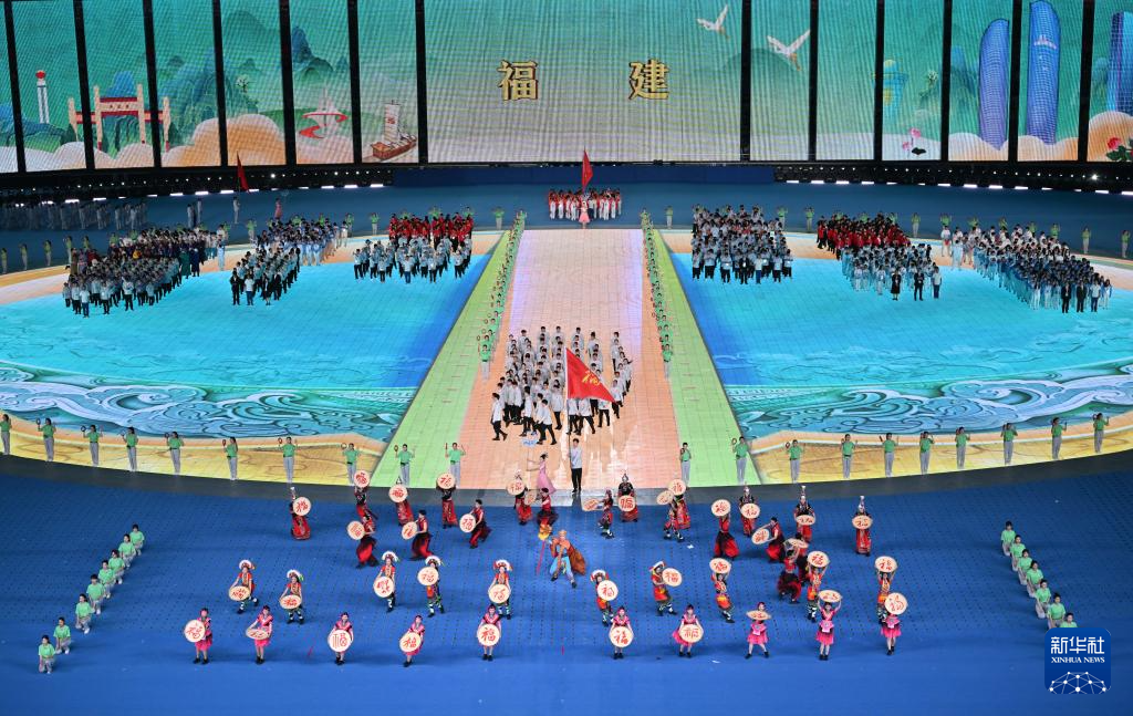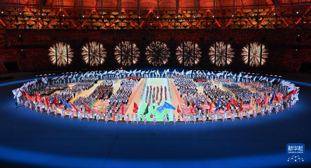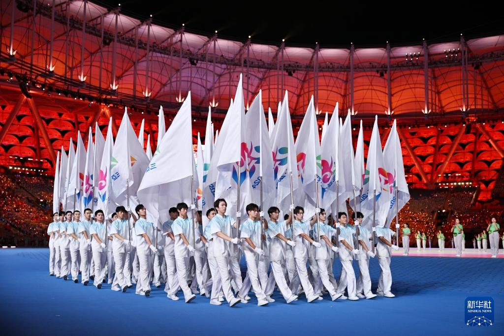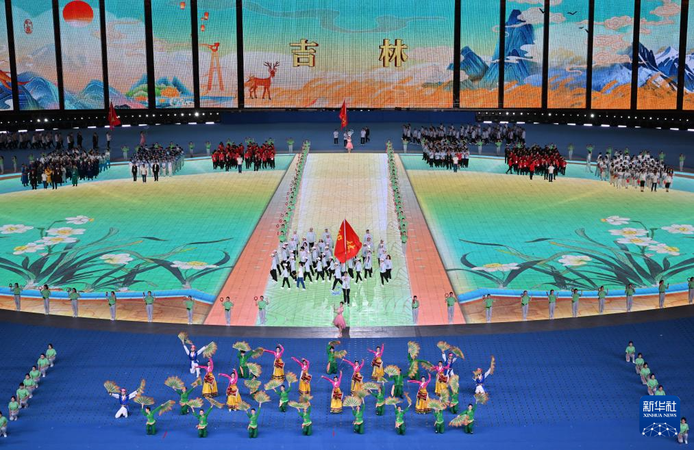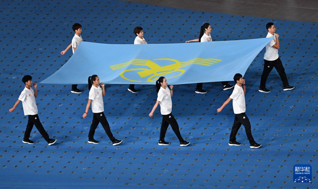 11月22日,中華人民共和國第十二屆少數民族傳統(tǒng)體育運動會會旗方陣在開幕式上入場。